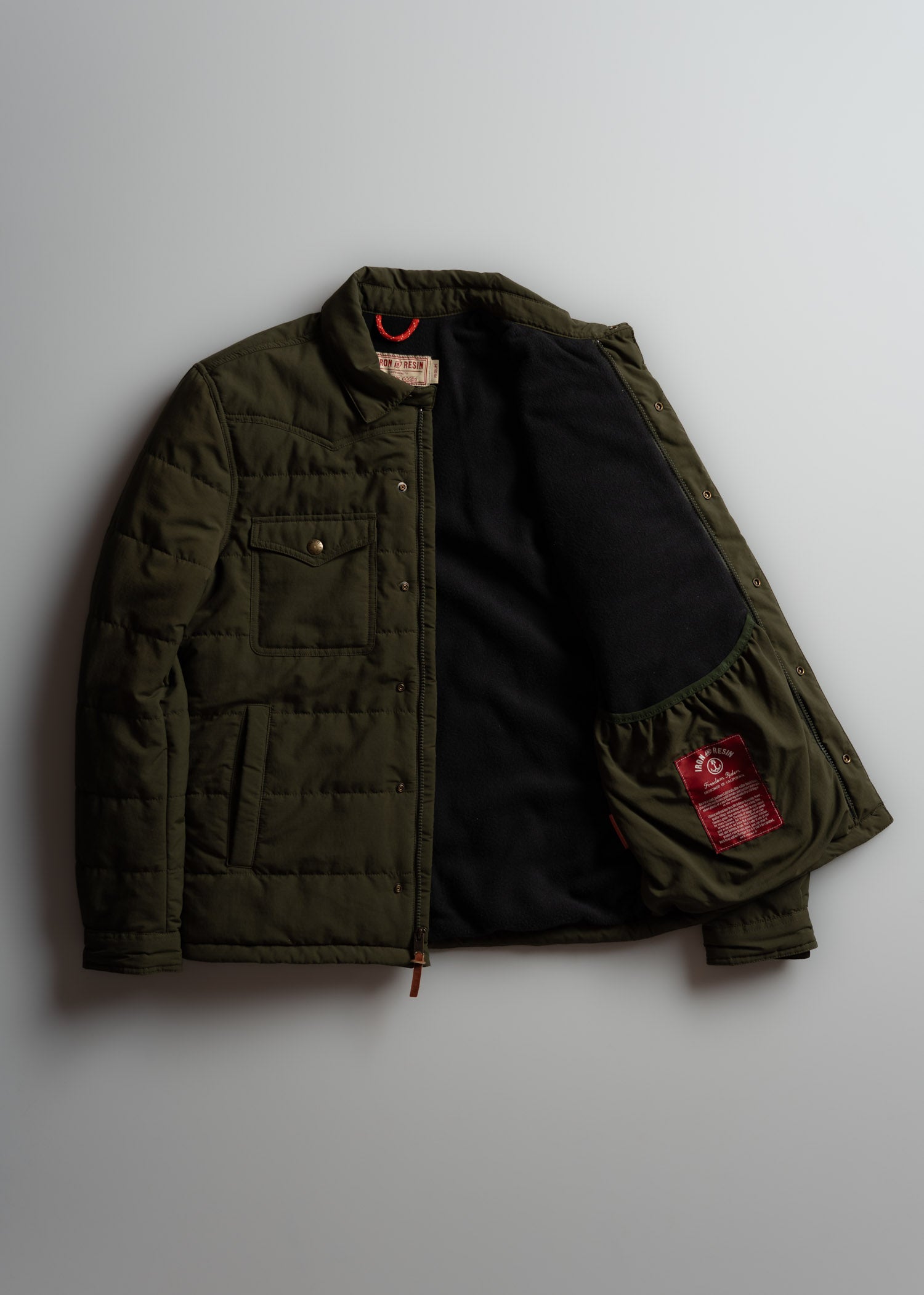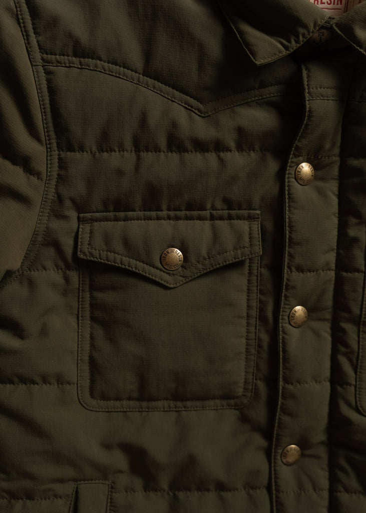The exterior is a tough ripstop shell built to shrug off abrasion and keep you moving without worry. Inside, a soft polar fleece lining adds real warmth and comfort. The insulation is made from a partially plant based polymer that traps heat without adding weight. It is the kind of cold weather layer you throw on for early rides, long drives, or slow mornings around town. Clean lines, western inspired yokes, and workwear details round it all out.